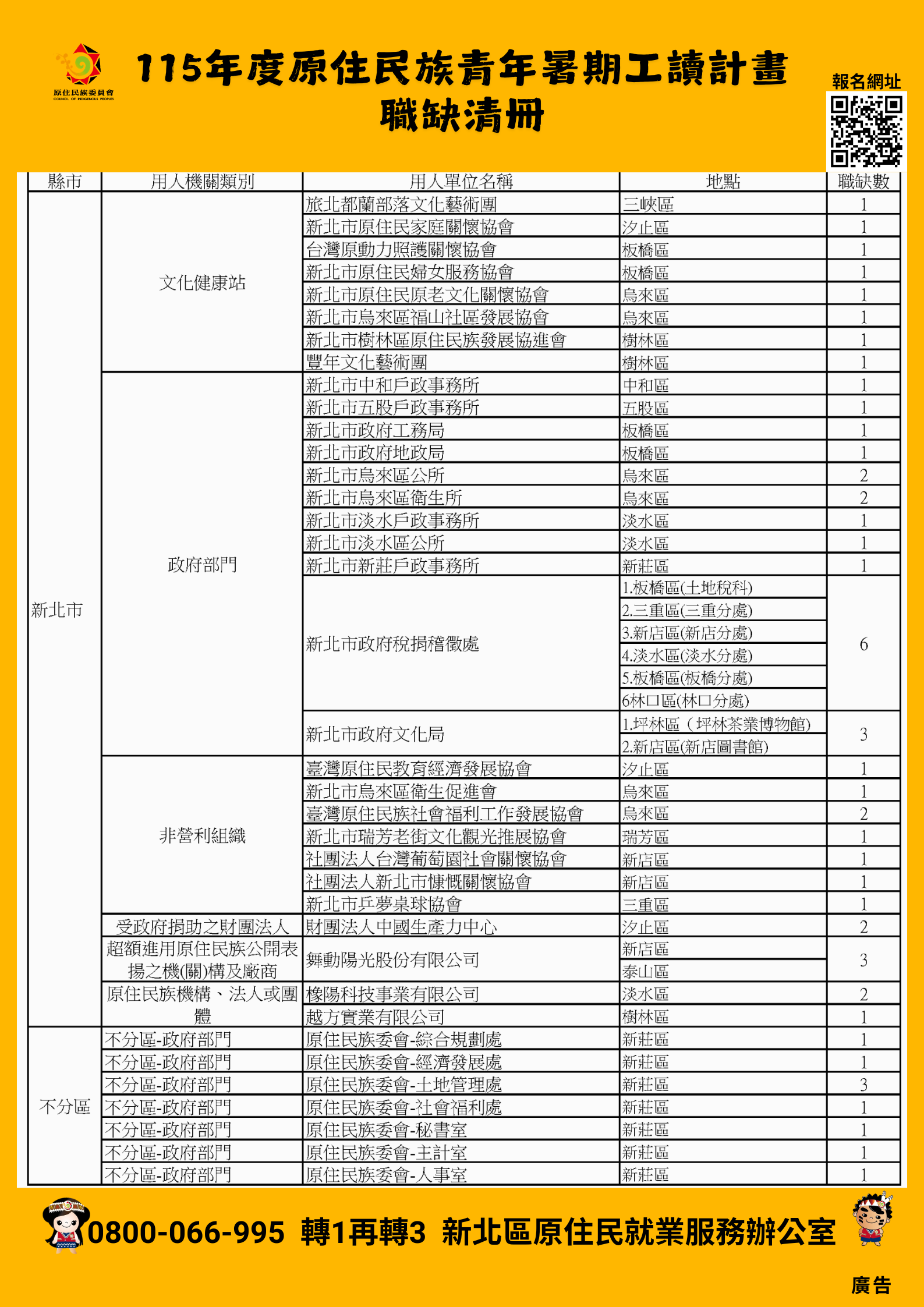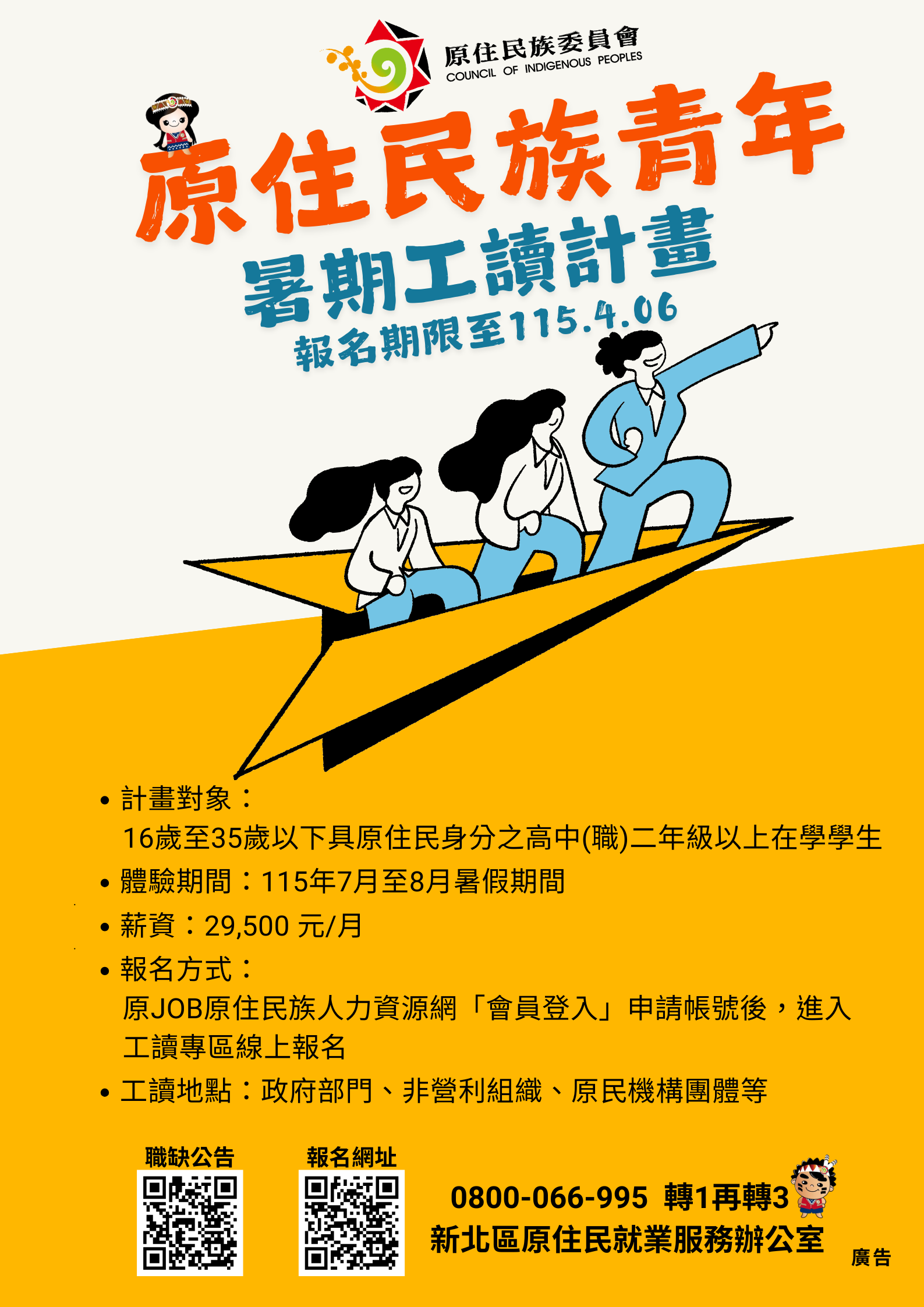 原民会115年暑期工读生计画开跑,学生报名截止日为115/4/6(一),线上申请网址:https://iwork.cip.gov.tw/Login/Login 2026-03-13 邱 一涵 323392_0.png 323393_0.png