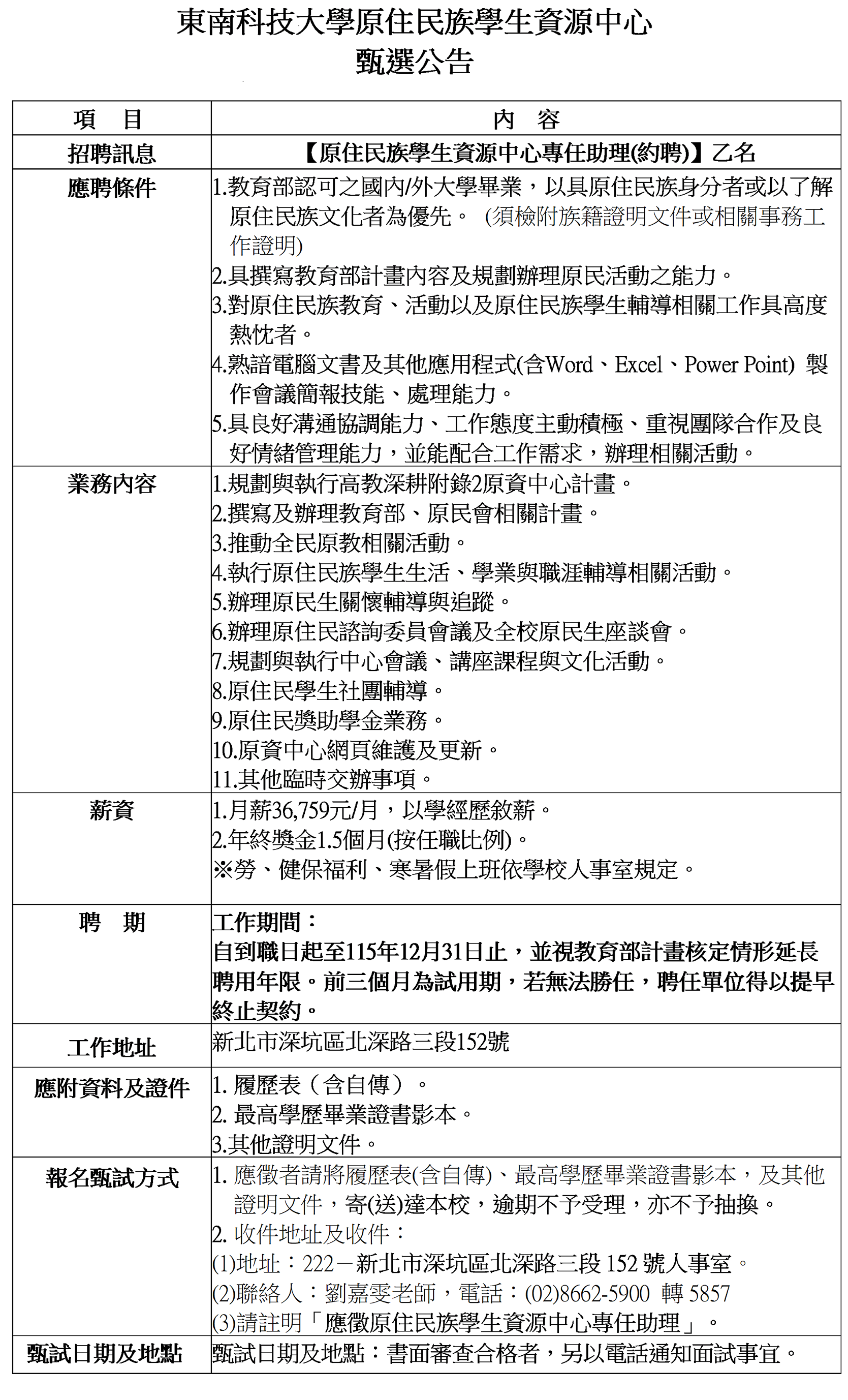 东南科技大学原住民族学生资源中心征才